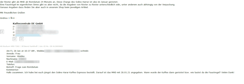 Bei Roastmarket war man besonders fix und hat eine sehr klare Antwort geliefert – rund 20 Minuten nach Absenden der Anfrage: