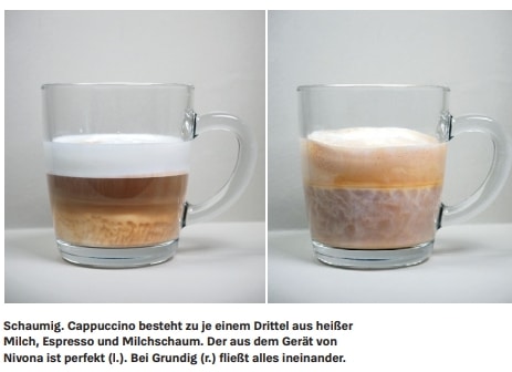 „Der [Cappuccino] aus dem Gerät von Nivona ist perfekt […]. Bei Grundig […] fließt alles ineinander”, ist dort zu lesen.